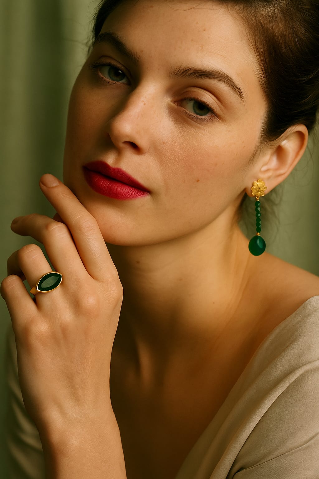 Egyptian-style gold-plated earrings decorated with tiny beads that enhance the design. Moving green Onyx stones hang from them, culminating in a larger central gem that adds strength and sophistication.