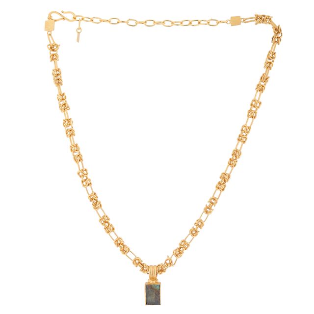 Since time immemorial, chains have symbolized unity and permanence. The AMULET necklace revisits that heritage with a laboriously handcrafted chain, from which a rough labradorite hangs like an amulet, reflecting the beauty of the ancient and the authentic.