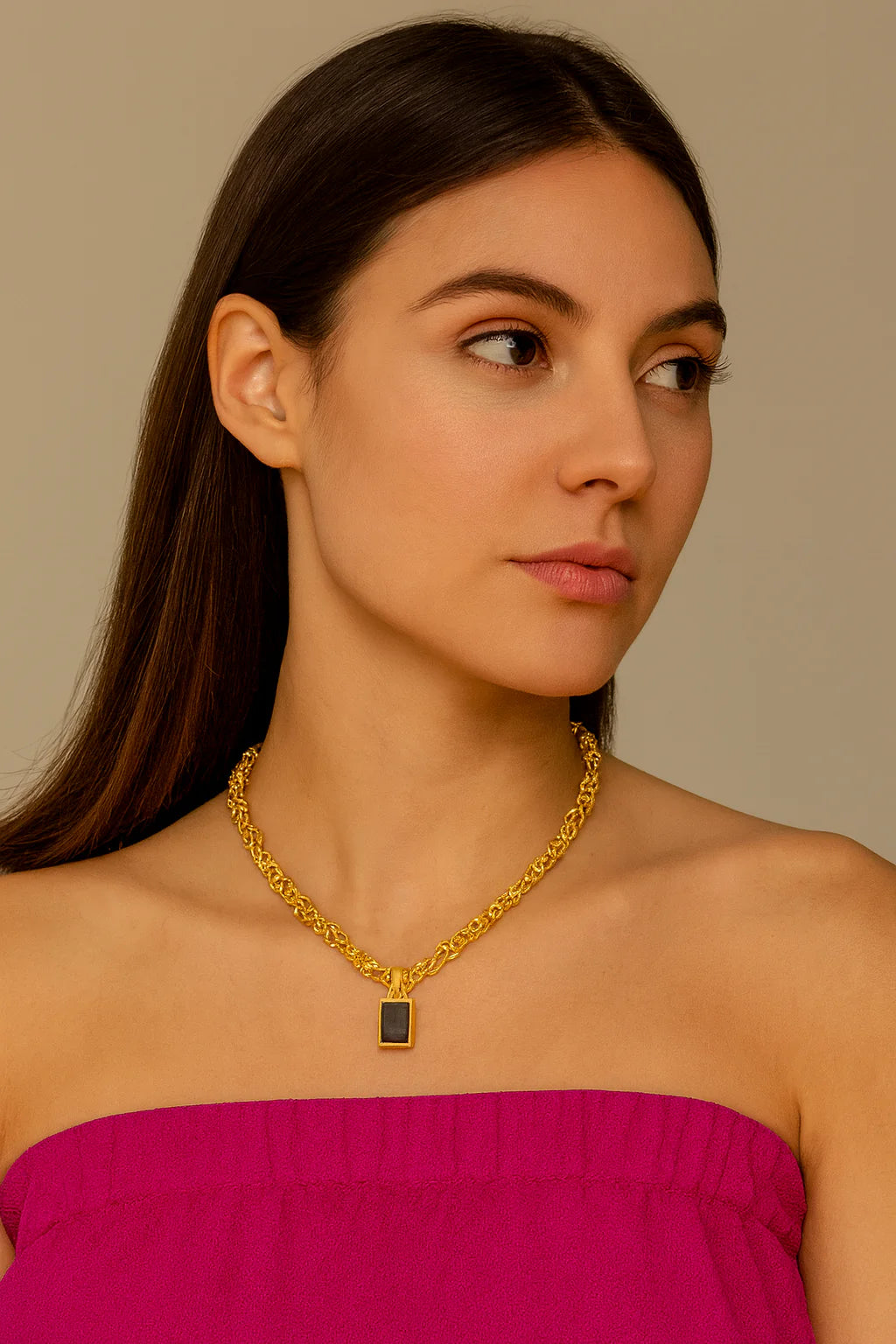 Depuis des temps immémoriaux, les chaînes symbolisent l'unité et la pérennité. Le collier AMULET revisite cet héritage avec une chaîne minutieusement confectionnée à la main, à laquelle pend une labradorite brute telle une amulette, reflétant la beauté de l'ancien et de l'authentique.