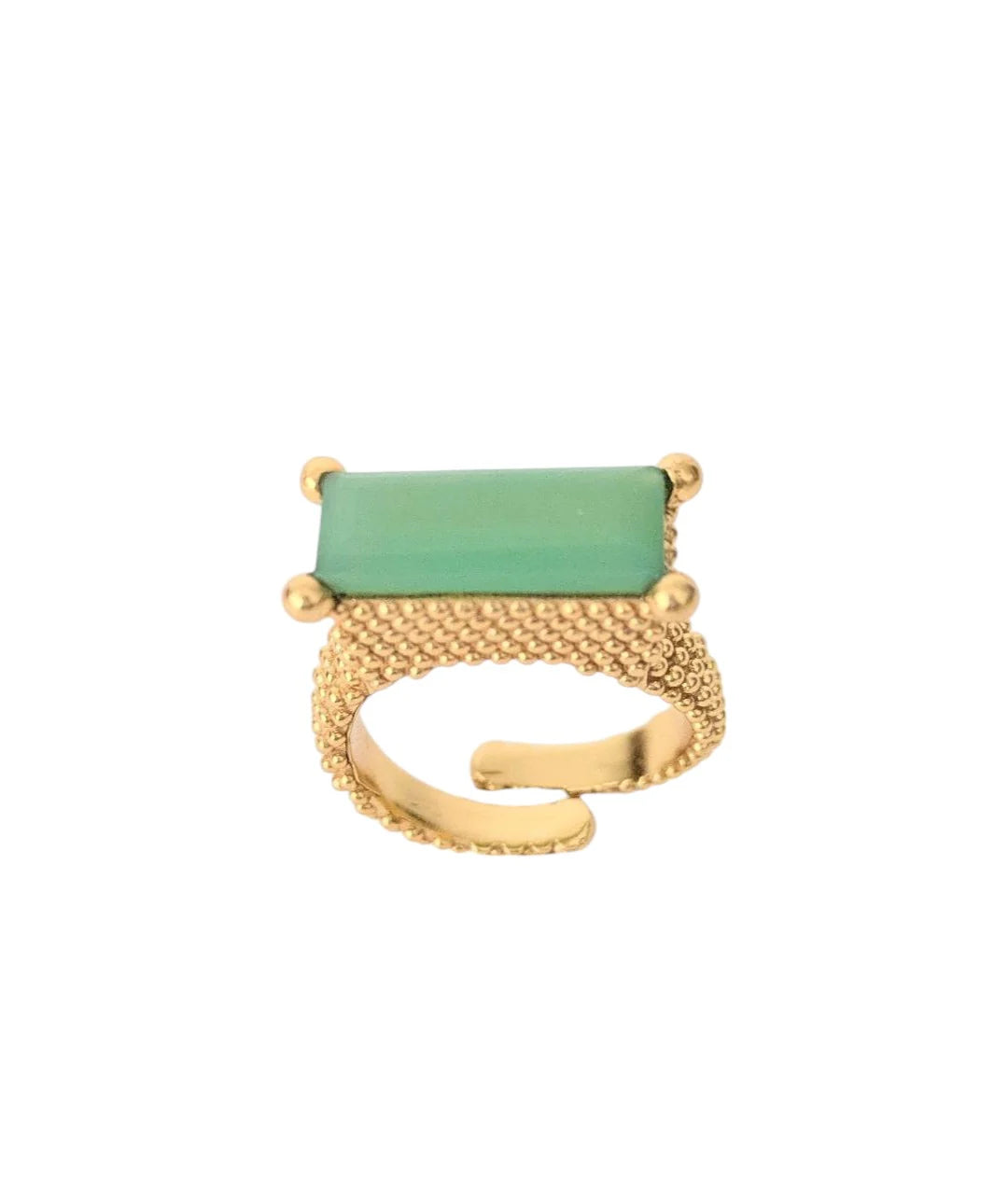 Un design qui capture la splendeur du passé et la transforme en un bijou contemporain. Cette bague arbore une majestueuse Chrysoprase rectangulaire taille baguette, sertie sur une base en or avec des de sphères finement sculptées .
