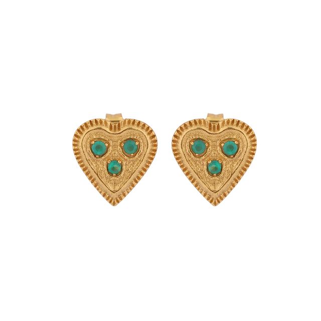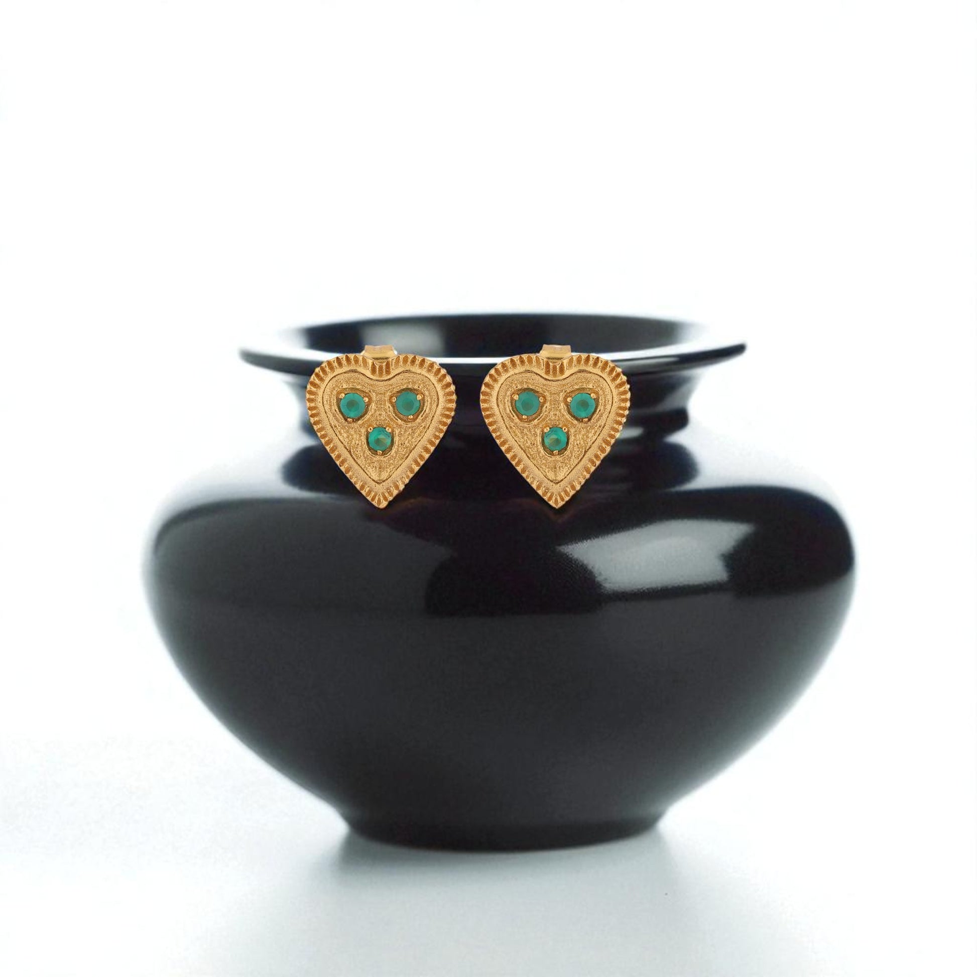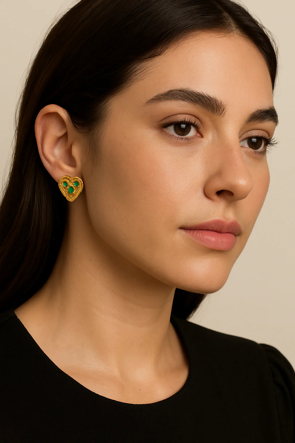 Des boucles d’oreilles en forme de cœur, comme découvertes dans un trésor ancien, dont la texture semble garder la trace du temps. Trois grenats naturels apportent profondeur et éclat, soulignant l’intensité chaleureuse de ces pierres précieuses. Un bijou délicat, chargé de caractère et de poésie.