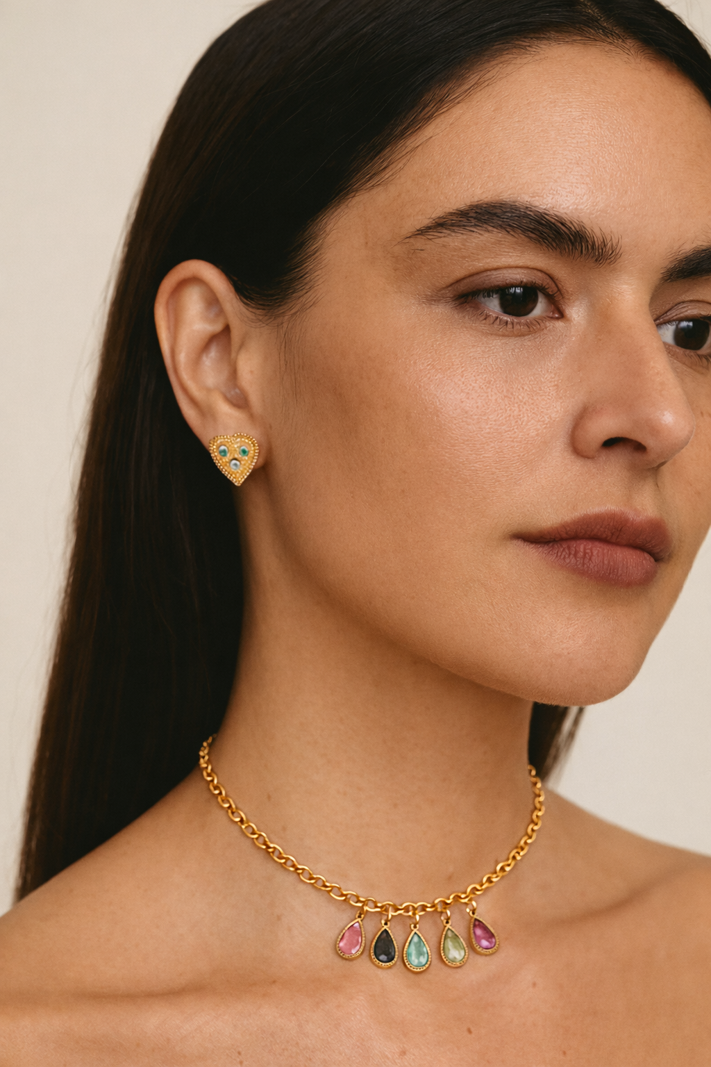 La tourmaline rose, l’aigue-marine, le citrine et le grenat se dévoilent en fines gouttes colorées, captant la lumière à chaque mouvement.