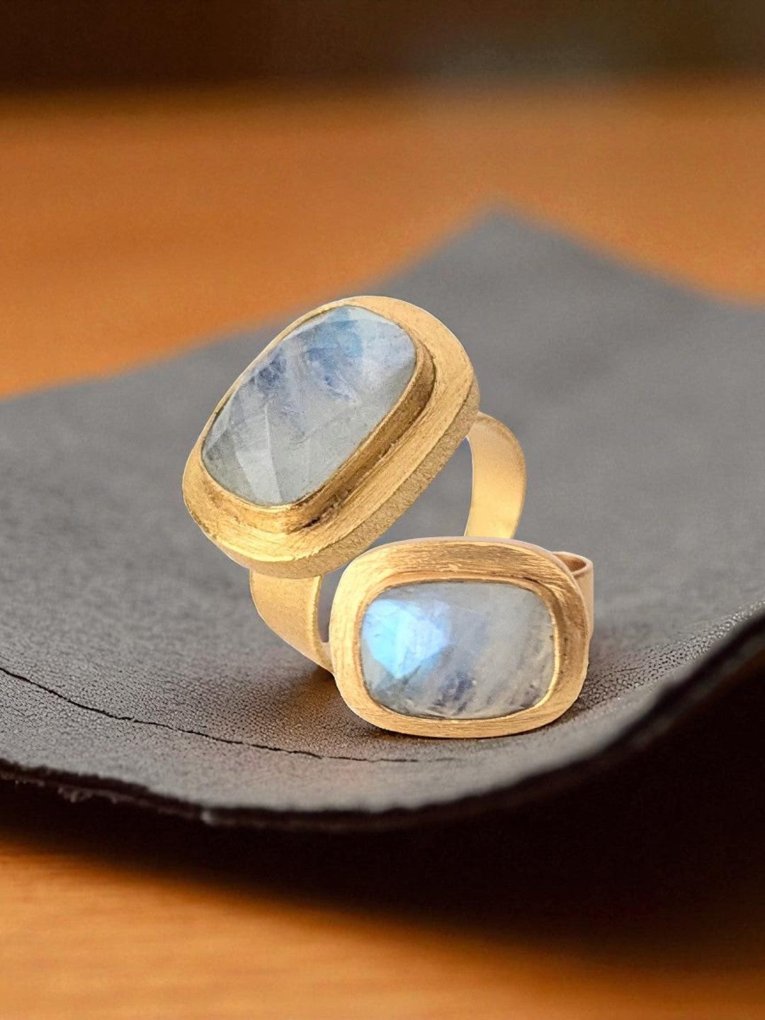 Cette bague se distingue par sa pierre de lune facettée d’une grande pureté, une gemme réputée pour son éclat éthéré et ses subtils reflets bleutés qui captent la lumière de manière presque hypnotique.