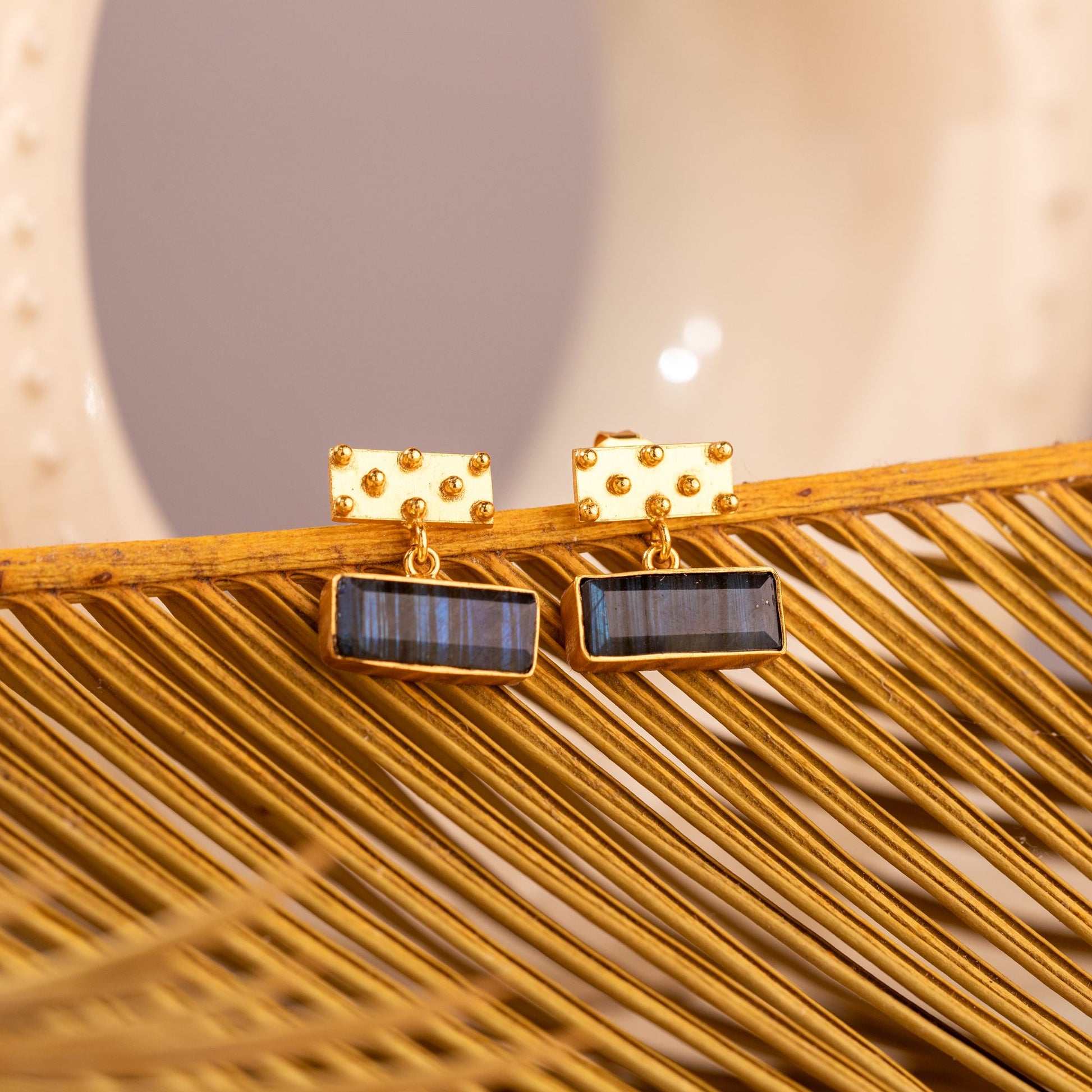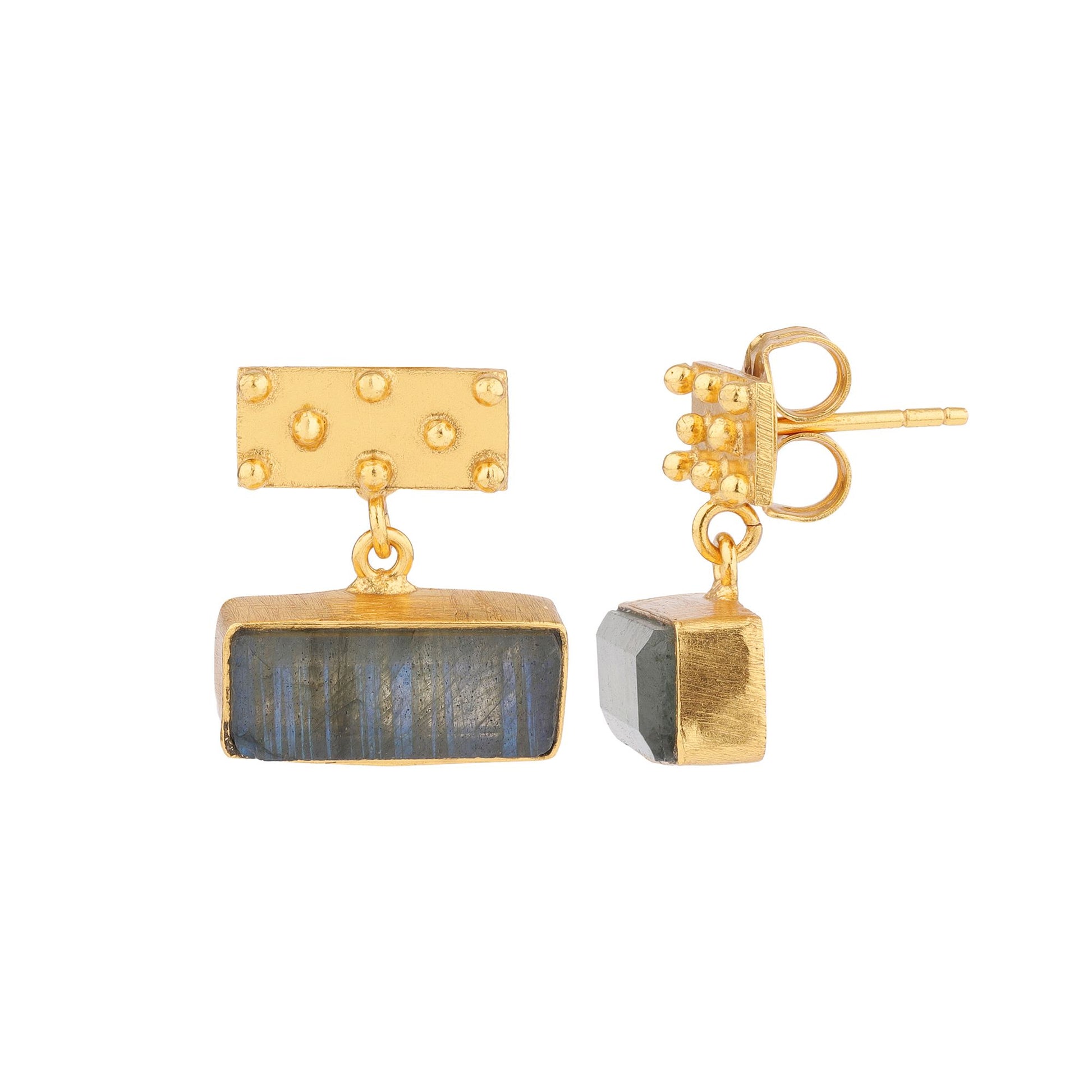 Pendientes pequeños de diseño delicado y elegante, con una fina chapa rectangular adornada con sutiles bolitas que aportan textura y encanto. De ella cuelgan iolitas rectangulares lapidadas, cuyo brillo y tonalidad natural añaden un toque de sofisticación y frescura. Una pieza versátil y ligera, perfecta para el día a día o para complementar looks más especiales.